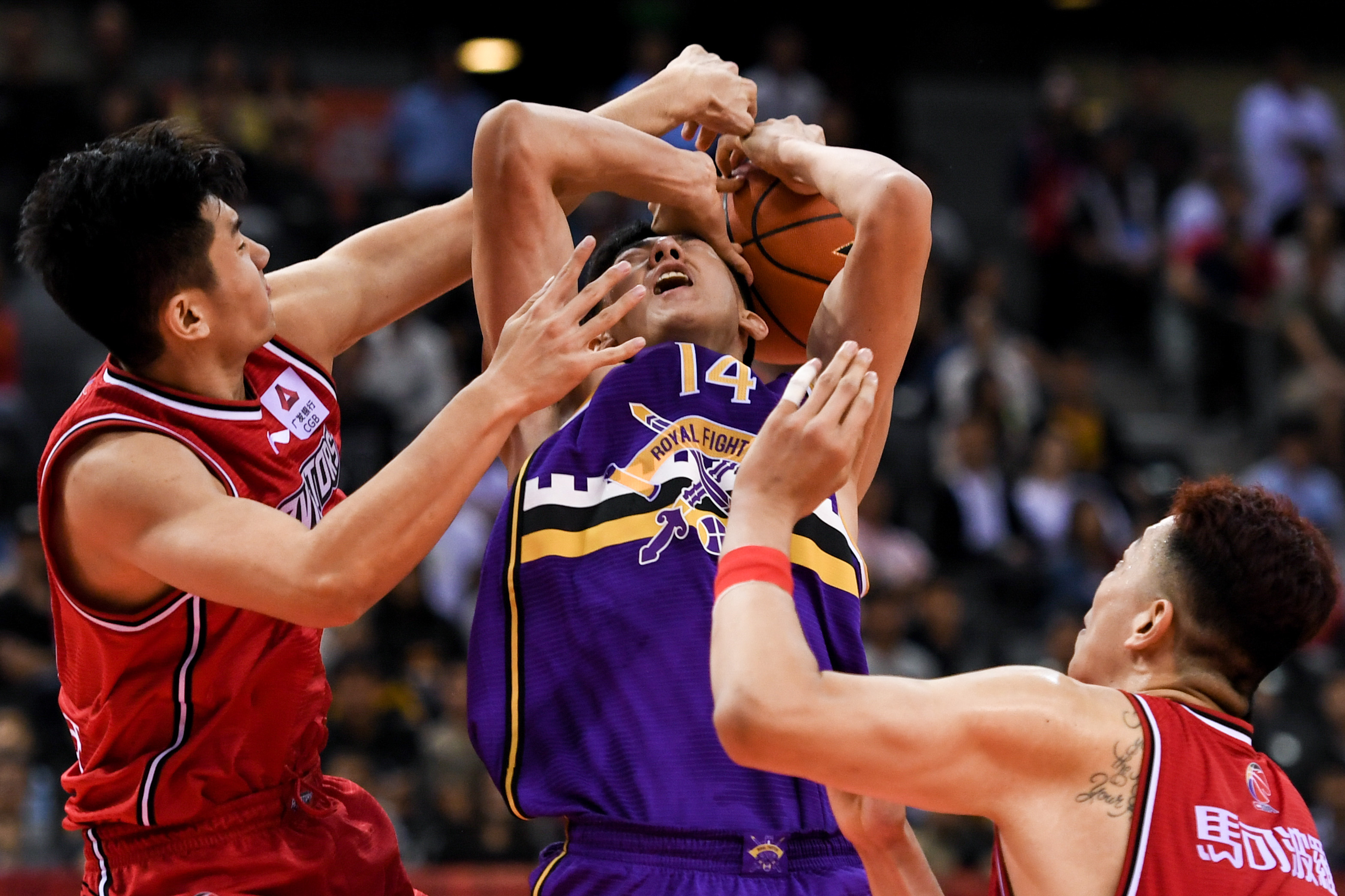11月10日,北京控股队球员王少杰(中)在比赛中争抢篮板球。当日,在2019-2020赛季中国男子篮球职业联赛(CBA)常规赛第四轮比赛中,深圳马可波罗队主场以87比94不敌北京控股队。新华社记者毛思倩摄