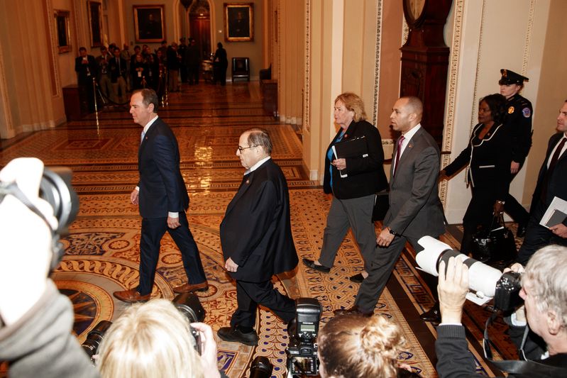 1月21日,在美国华盛顿,美国众议院情报委员会主席希夫(左一)、美国众议院司法委员会主席纳德勒(左二)等前往参议院。新华社发(沈霆摄)