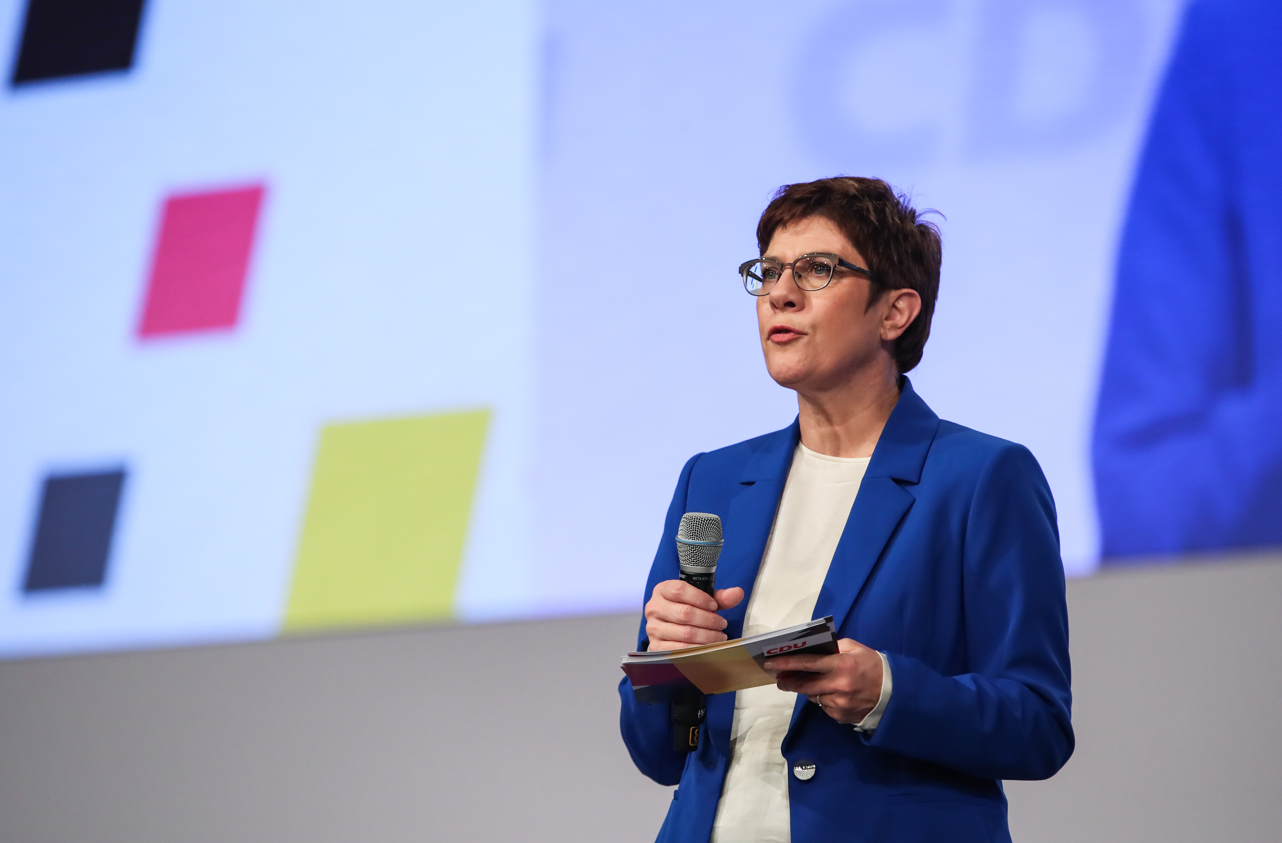 2019年11月22日,在德国莱比锡,德国基民盟主席、德国国防部长克兰普-卡伦鲍尔出席德国基督教民主联盟(基民盟)全国党代会。(新华社记者单宇琦摄)