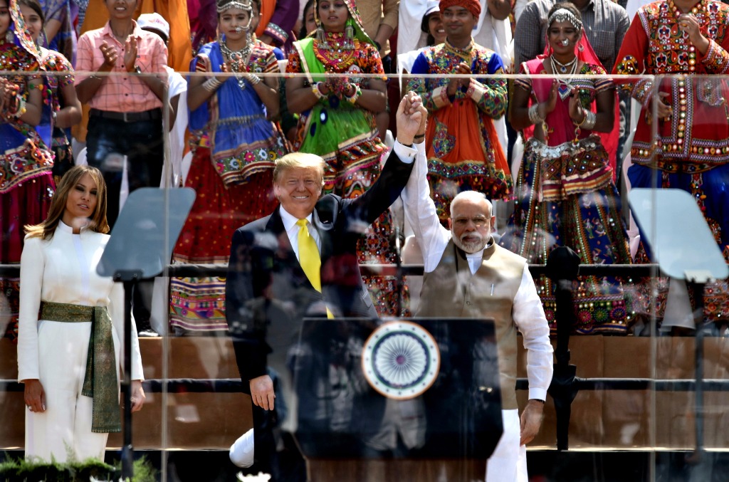 2月24日,在印度艾哈迈达巴德莫特拉体育场,印度总理莫迪(前右)与到访的美国总统特朗普(前中)及其夫人梅拉尼娅(前左)参加欢迎活动。(新华社发)