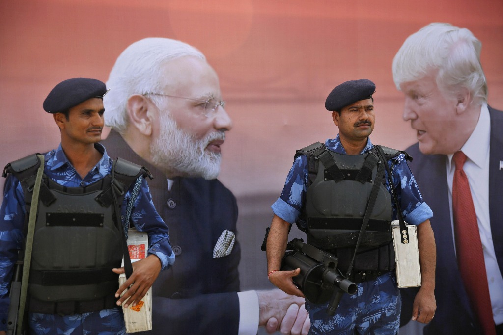 2月23日,在印度阿格拉,安保人员站在美国总统特朗普和印度总理莫迪的海报前。(新华社/美联)
