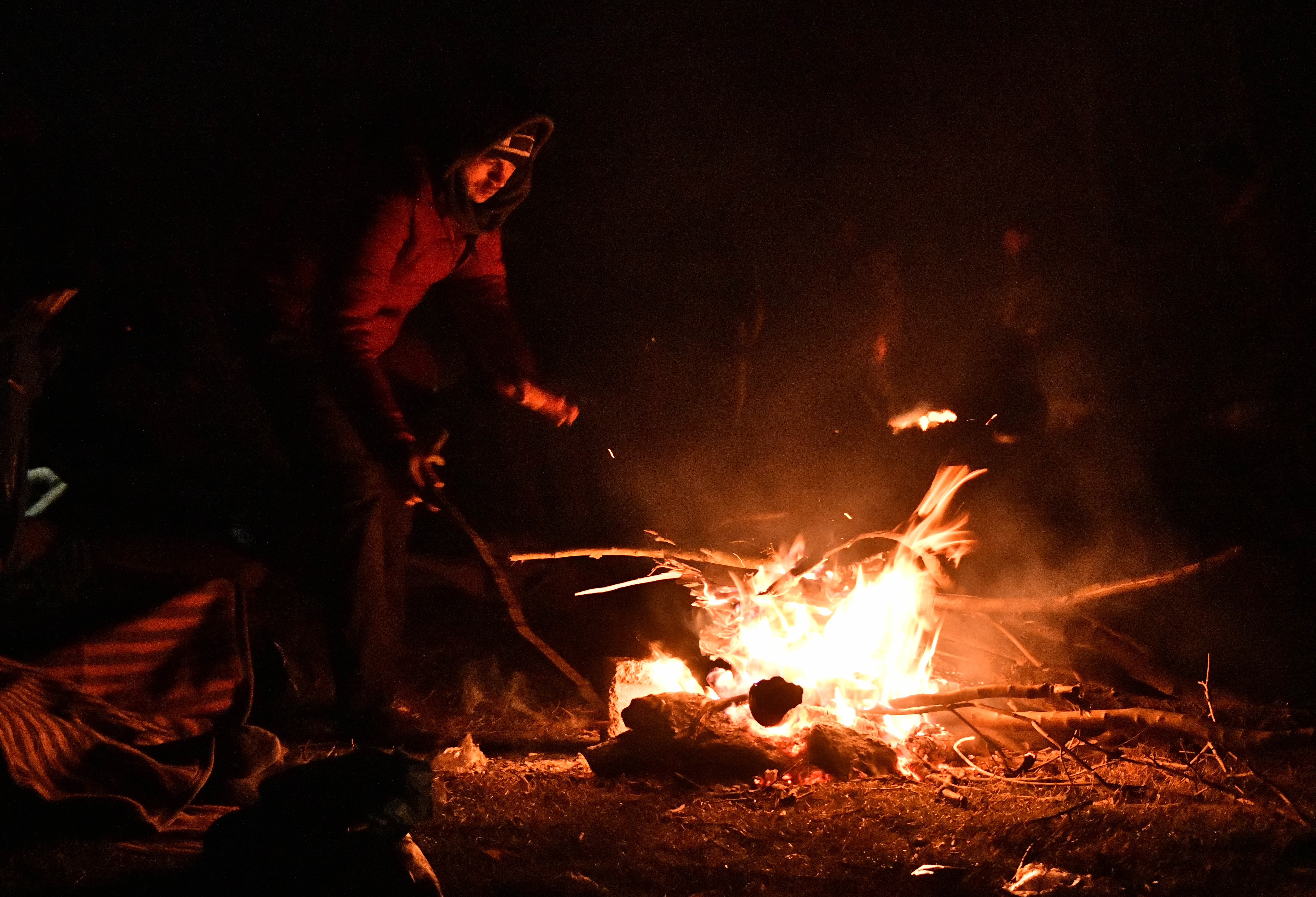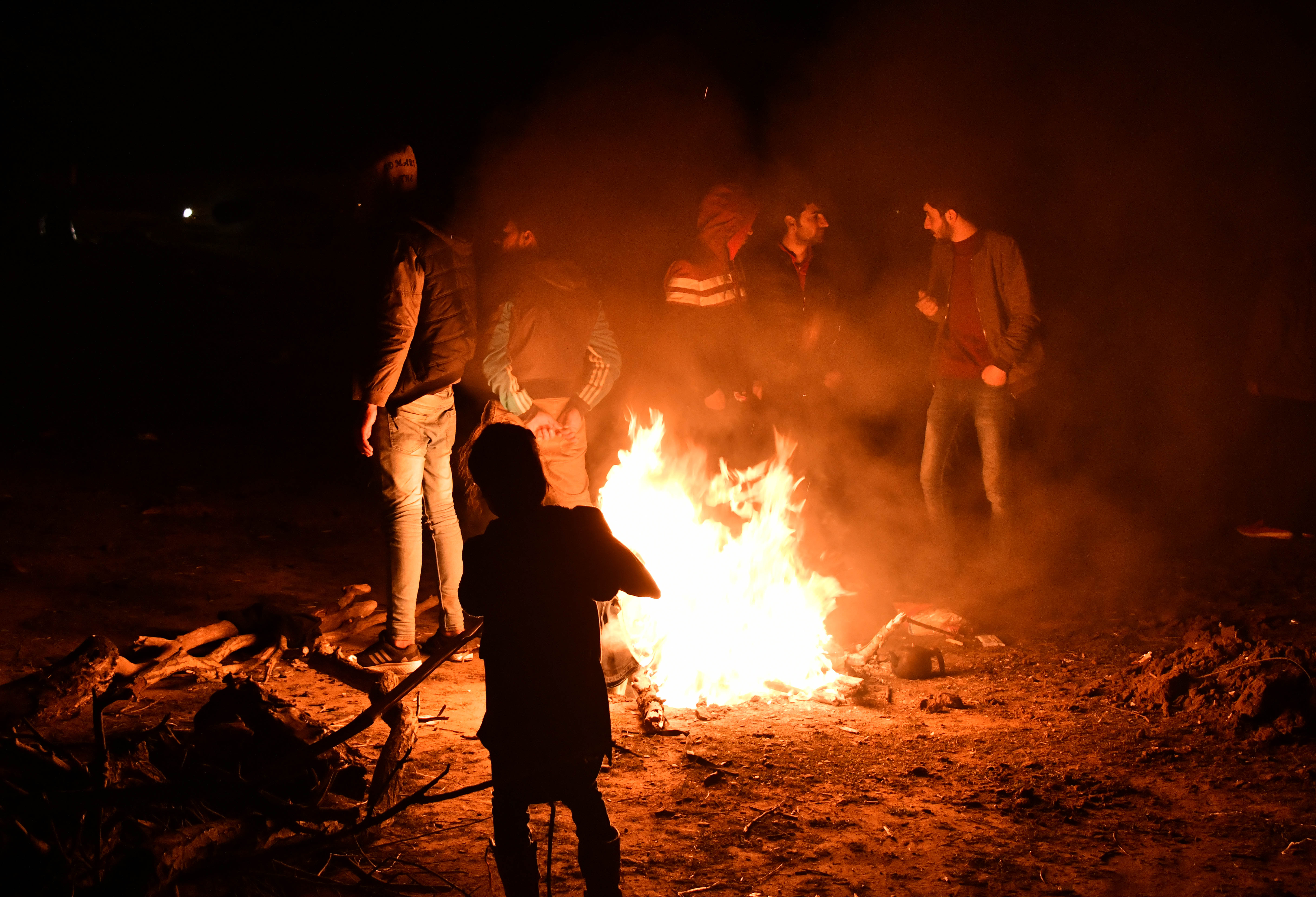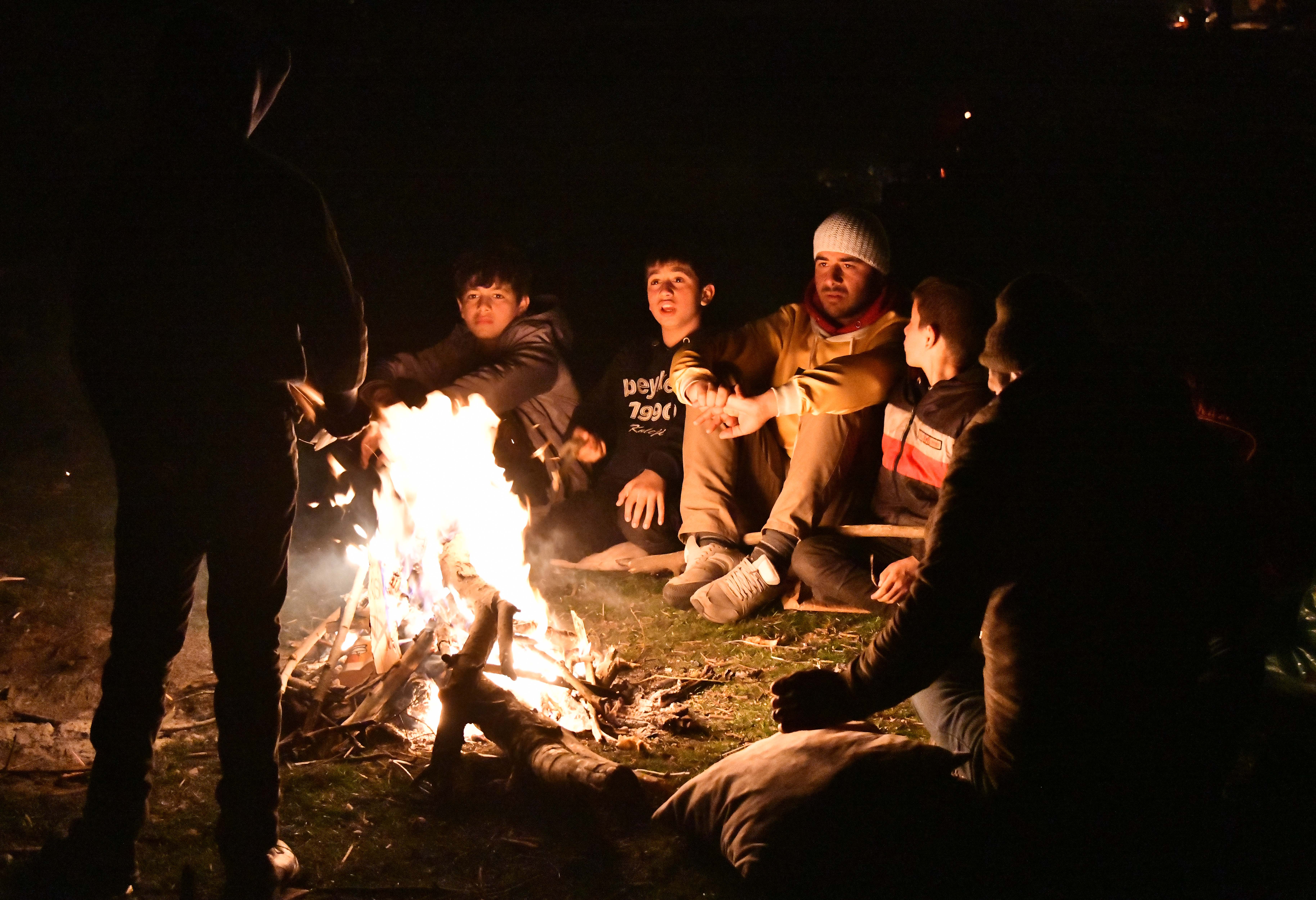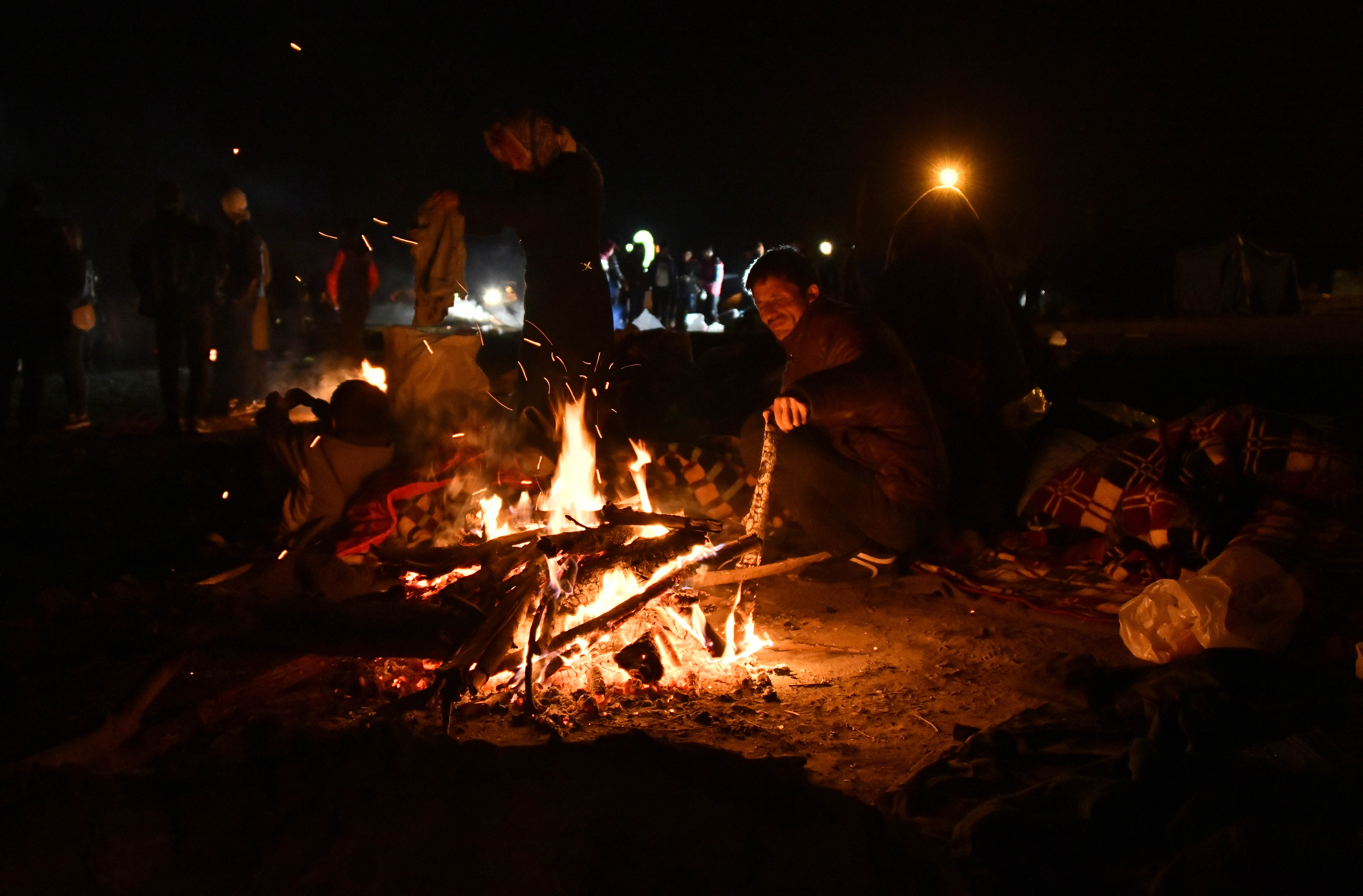 ↑3月3日,在土耳其埃迪尔内省靠近希腊的边界地带,一些非法移民在户外点燃篝火取暖。新华社记者 徐速绘 摄