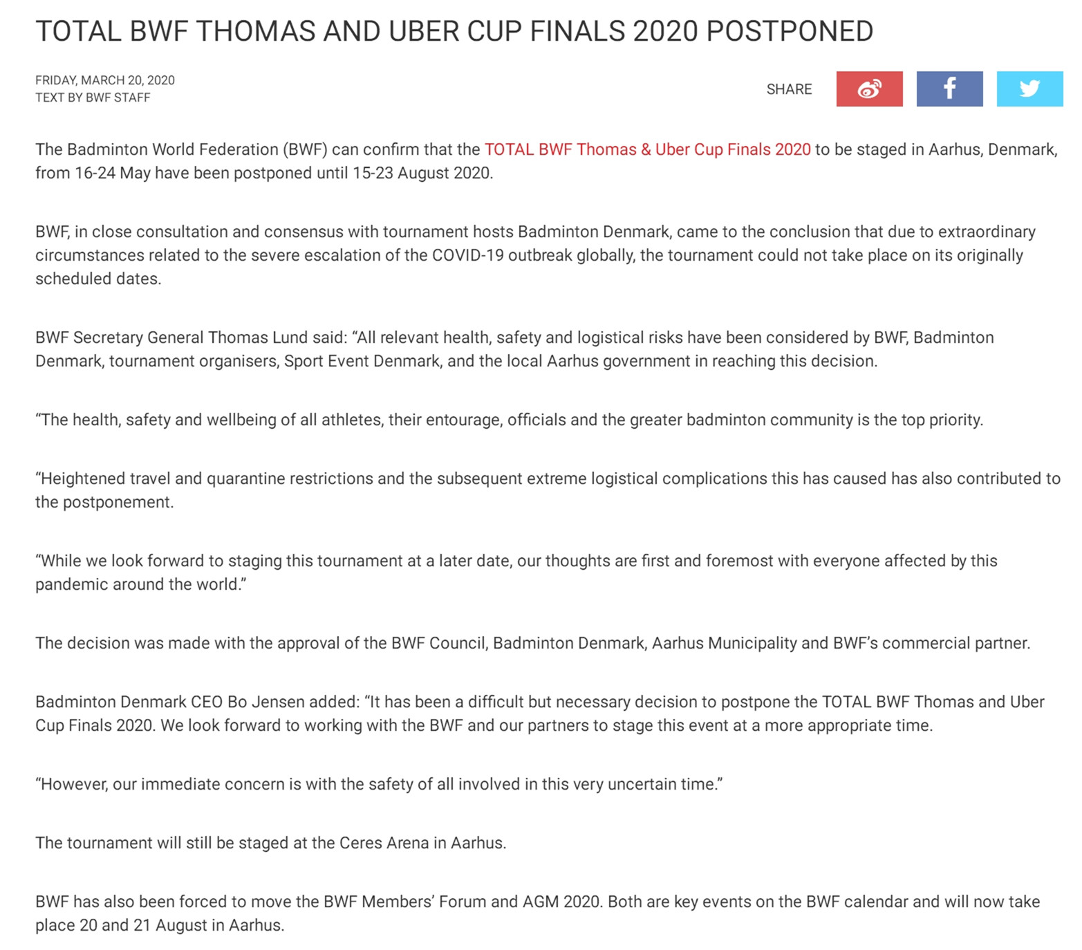 世界羽联同时表示,由于汤尤杯推迟,世界羽联的论坛和年度大会将推迟到8月20日至21日于奥胡斯举行。