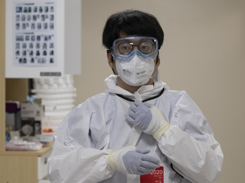 3月18日,在韩国大邱启明大学东山医院,一名医生准备进入负压病房内查看重症患者情况。新华社发(李相浩摄)