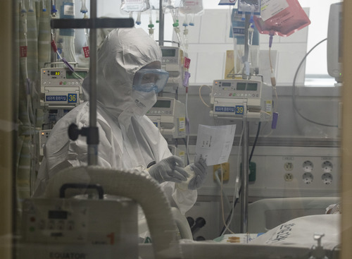 3月18日,在韩国大邱启明大学东山医院,一名医生在负压病房内查看某重症患者情况。新华社发(李相浩摄)