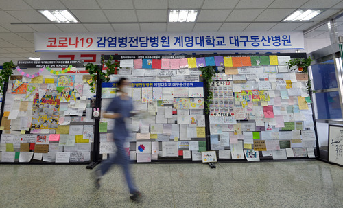 3月23日,在韩国大邱,启明大学东山医院里贴满了对医护人员的祝福和加油纸条。新华社/纽西斯通讯社