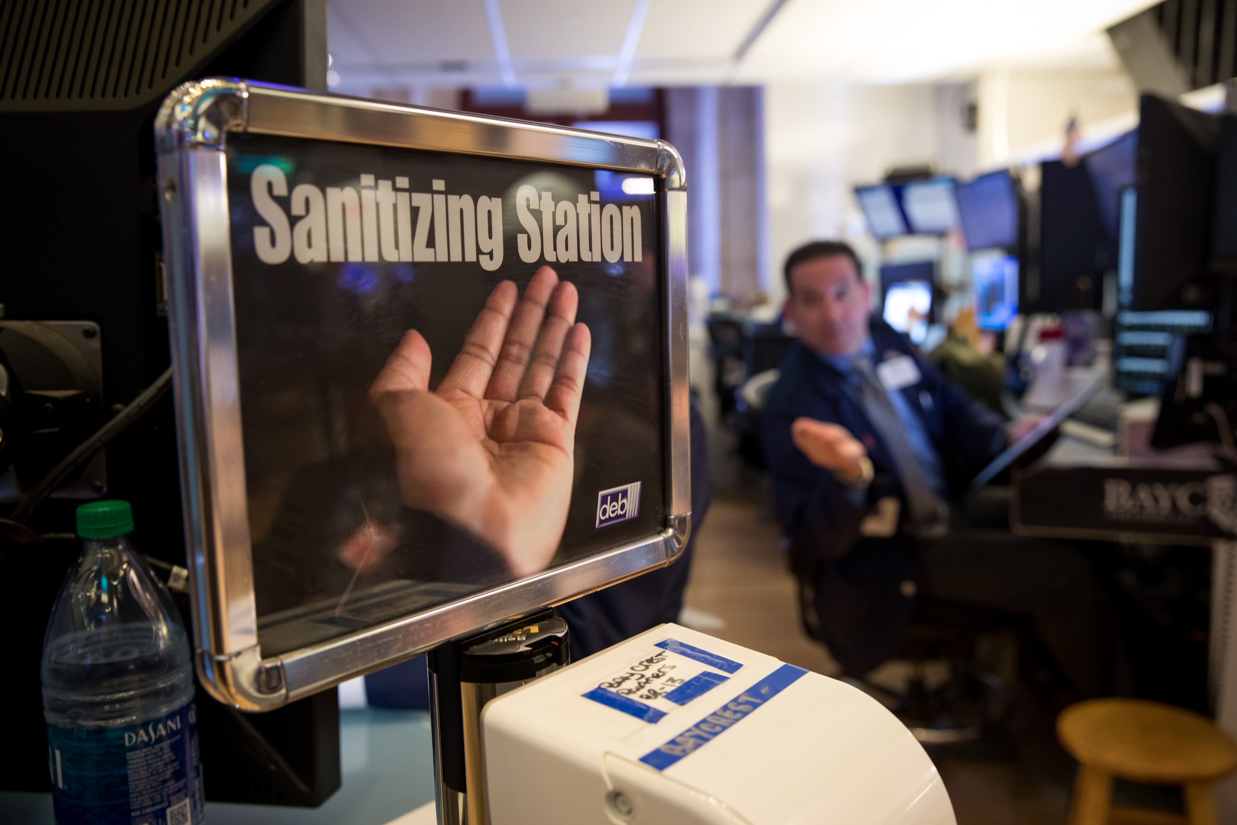 2020年3月11日,美国纽约证券交易所为防控新冠肺炎疫情增设手部清洁液盒。(新华社发,郭克摄)