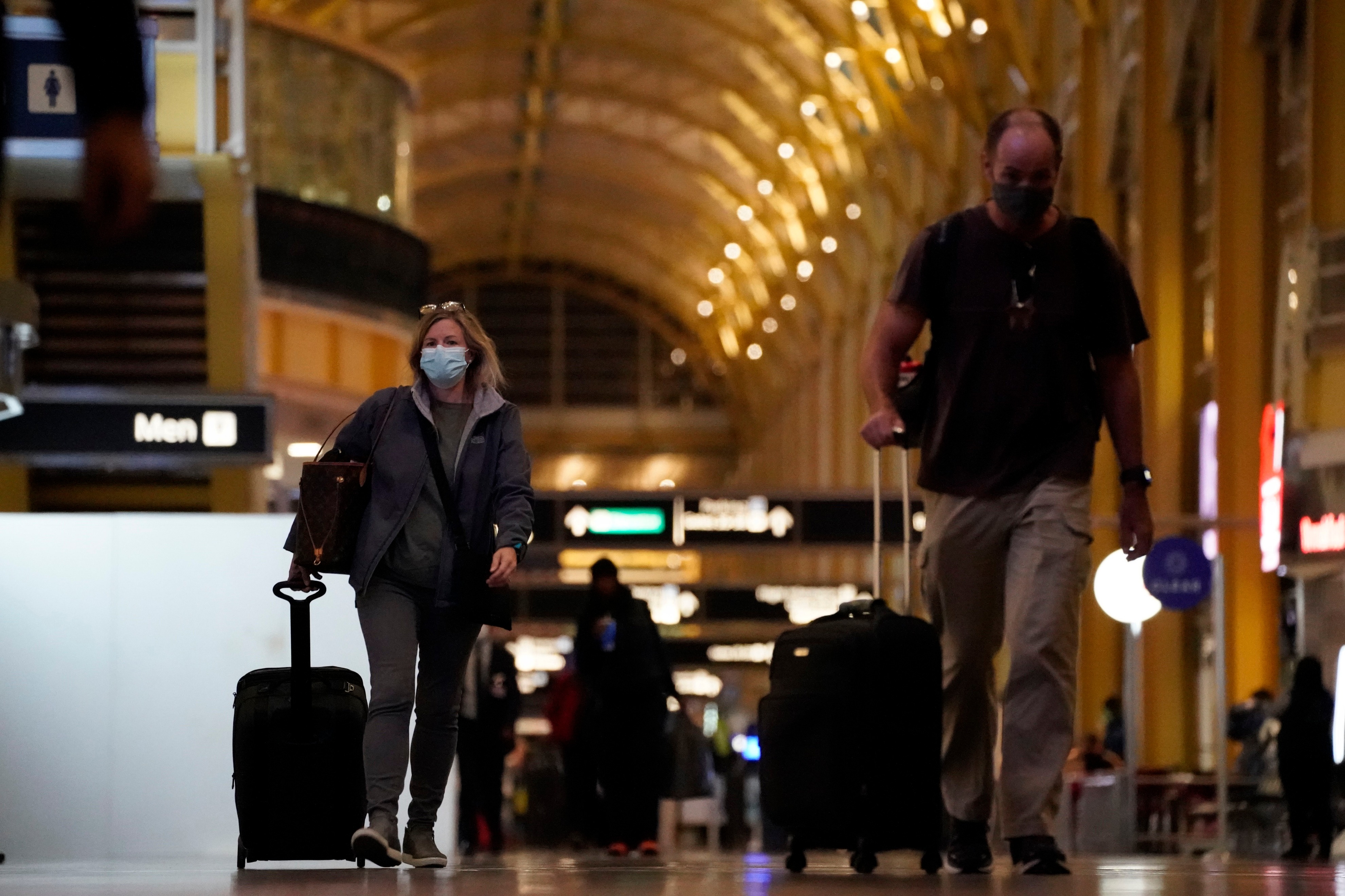11月8日,在美国弗吉尼亚州阿灵顿的里根国家机场,旅客戴着口罩走在航站楼里。(新华社发,沈霆摄)