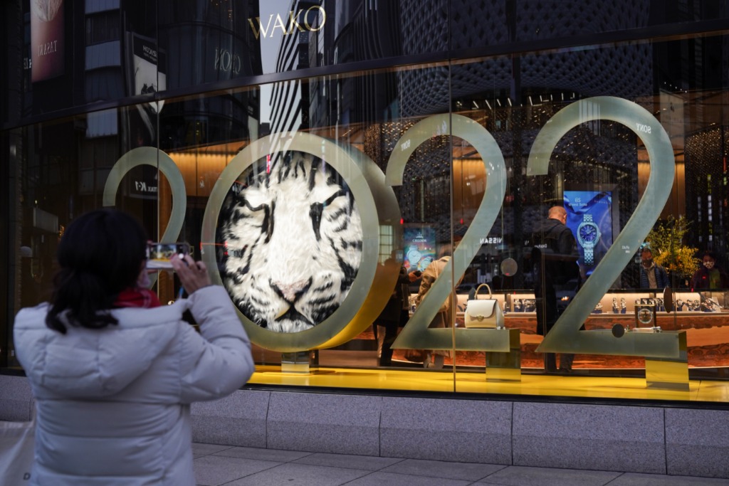 2021年12月28日,行人在日本东京银座拍摄一家商店橱窗里的“2022”标识。(新华社发,克里斯托弗·朱 摄)