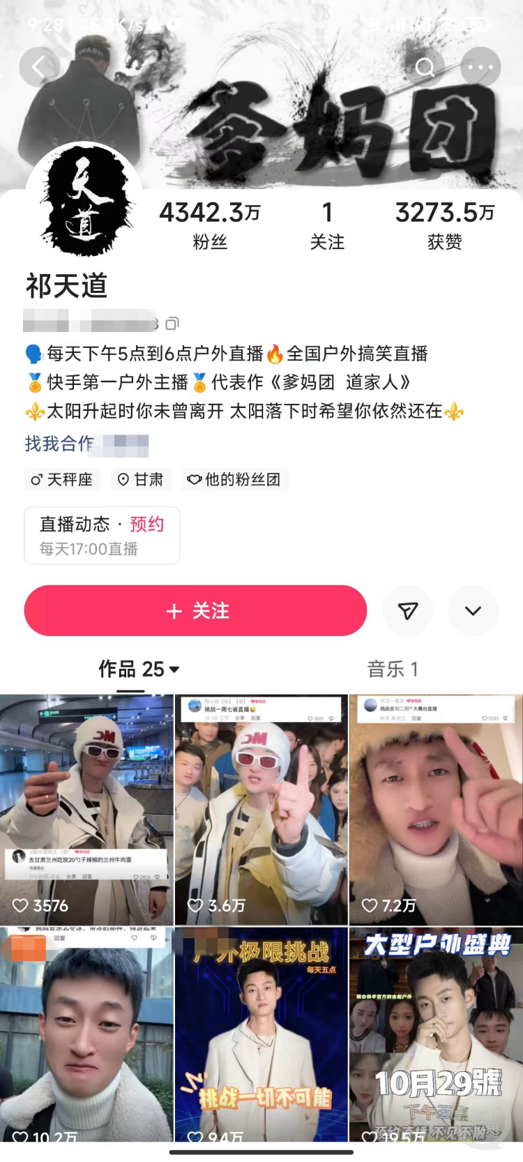 法院宣判后,有关短视频平台封禁了两人的直播账号。不过据报道,2021年“祁天道”在某短视频平台的账号悄然解封,2022年7月他在该平台上发布视频,高调宣布将于7月9日正式回归直播。上游新闻(报料邮箱baoliaosy@163.com)记者看到,如今的“祁天道”账号在某短视频平台已经拥有4300多万粉丝,发布视频作品25个,号称“XX第一户外主播”“每天下午5点到6点户外直播”。