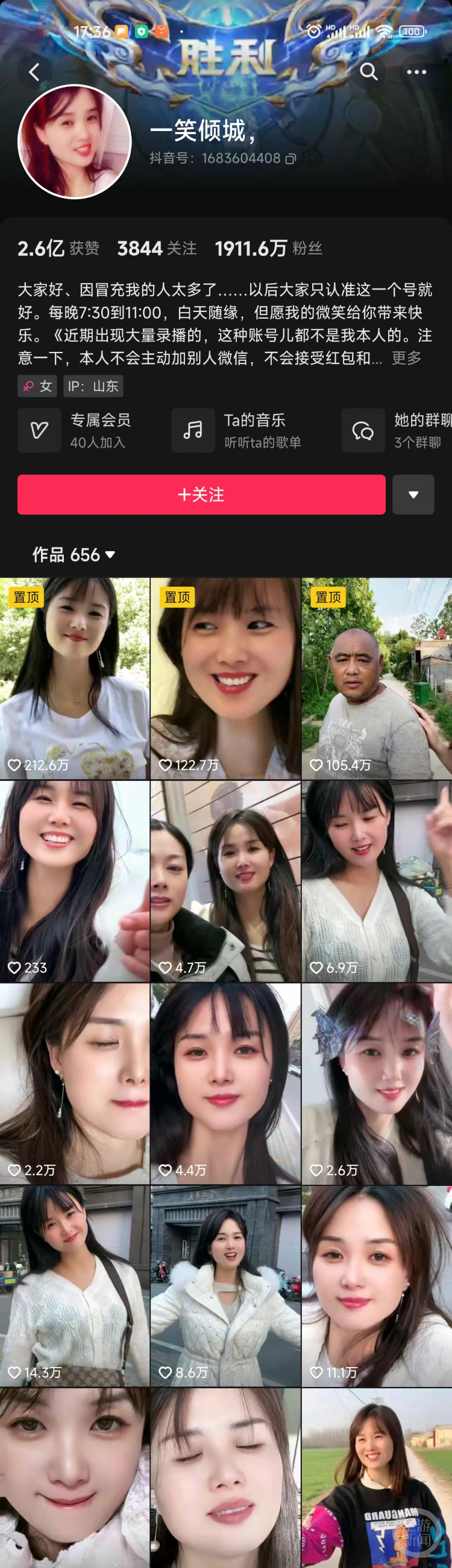 今年11月4日,网红“一笑倾城”在某短视频平台时隔两个多月再次更新视频,视频内容为对口型演唱。根据其首页,上一次更新停留在8月20日,停更原因则是“家中有事休息”。其后不久,与其风格类似的“秀才”账号被封。据报道“一笑倾城”凭借邻家女孩的人设出圈,通过对口型唱歌收获大批中老年用户。