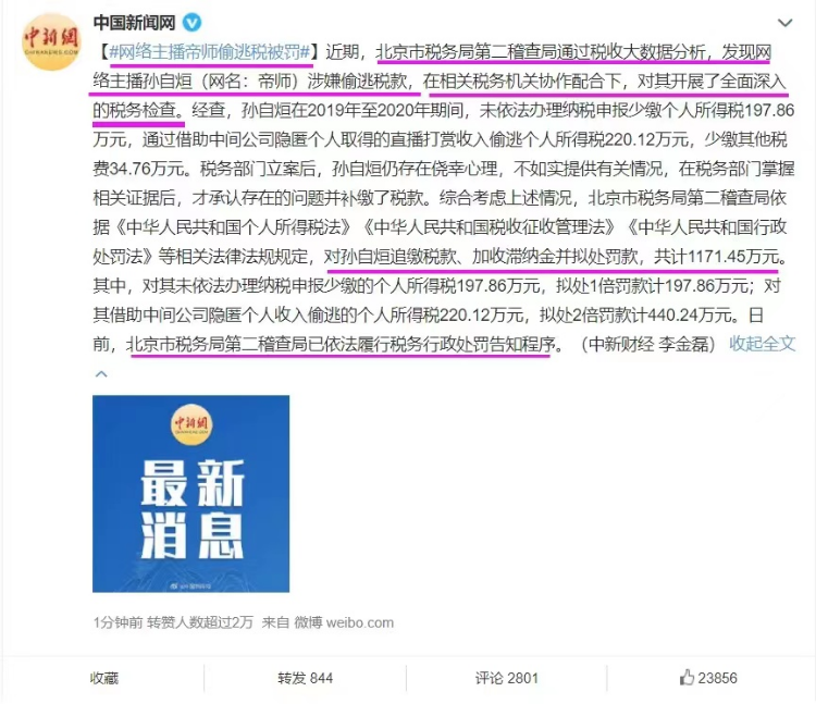 据媒体报道,2022年5月,网红“帝师 ”宣布退网,6月9日国家税务总局宣布,北京市税务局第二稽查局通过税收大数据分析,发现网络主播孙自烜(网名:帝师)涉嫌偷逃税款,从2019年到2020年,“帝师 ”共逃避税款197.8600万元,并通过中介公司隐瞒了220.12万元的直播打赏,少缴其他税款34.76万元。他被追缴税款、加收滞纳金、拟罚款1171.45万元。