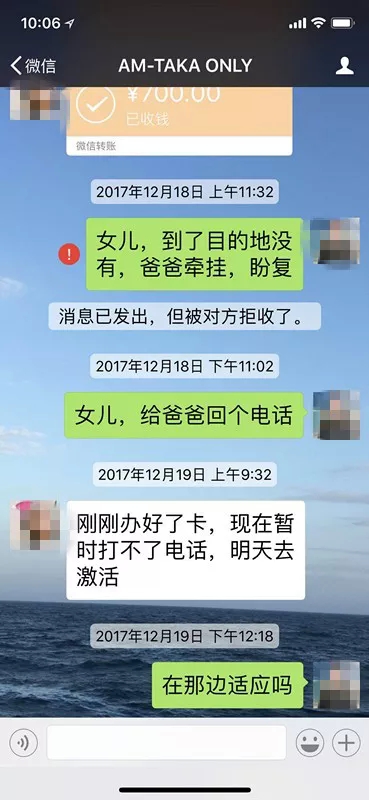 柴先生说其实此事早有端倪。他与女儿的聊天记录显示,女儿出发当晚11点02分,柴先生询问女儿是否到达加拿大时,消息被女儿拒收。12月19日上午9点32分,女儿给他回复“刚刚办好卡,现在暂时打不了电话,明天去激活。”