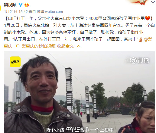 近日,一名从上海打工返回家乡过春节的宜宾籍农民工,背着自己在工地上做的小木凳乘车25小时,带回家给孩子写作业用,走红网络,并被媒体称为“世上最伟大的板凳爸爸”。这位不知名的“板凳爸爸”一夜之间成为举国关注的“网红”。