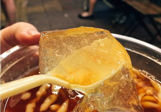 吃完这些重口味的,再去街边的“童年小吃”排队买上一碗成都冰粉界的爱马仕,才算圆满。这个阿姨人称“女版李伯清”,卖的手搓冰粉,味道是小时候的味道,但还有豪华升级(所以才说是爱马仕喃……)