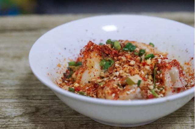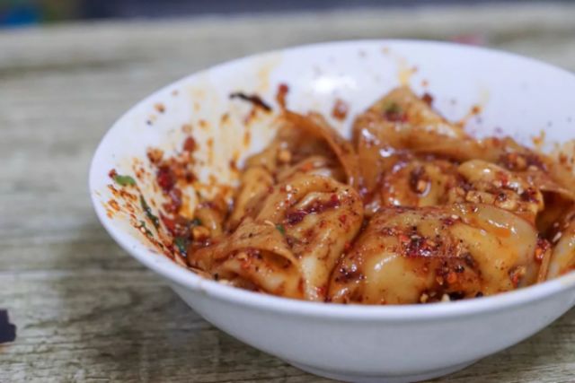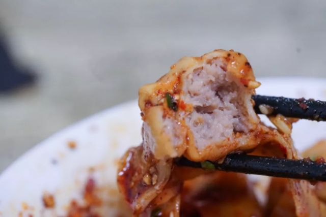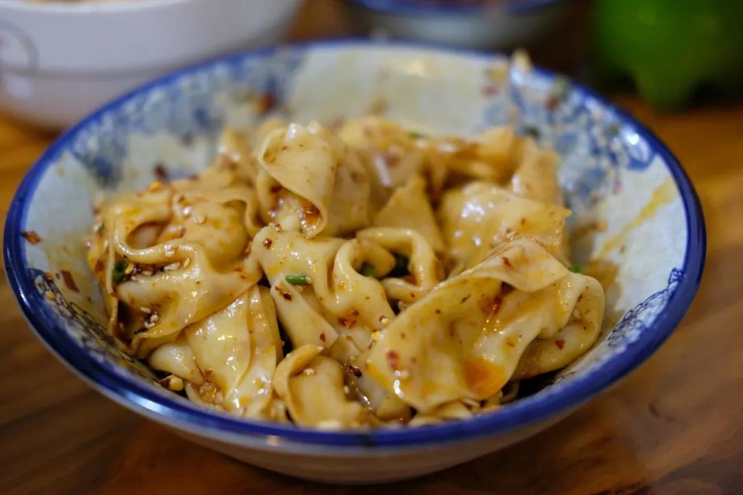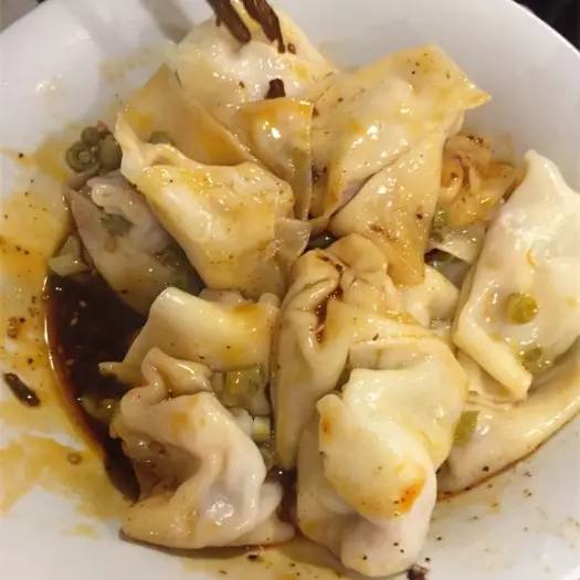 入口就会发现虽然同样有油泼辣子的味道,但是吃进嘴里还有一股清淡的甜味。这是因为老板在这份抄手中另外加了钟水饺的调料,比起单纯的辣椒与蒜香,吃起来更有层次感。
