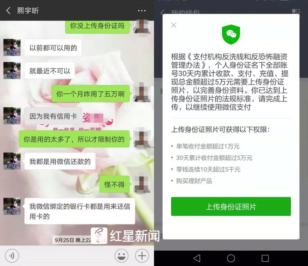 据戴新艳提供给红星新闻记者的微信聊天记录截图显示,戴某花曾请求戴新艳支付宝转300元钱,原因是自己微信转账被限制使用。戴新艳好奇,“你一个月咋用了5万呀?”戴某花则回答说,“我微信绑定的银行卡都是用来还信用卡的。”