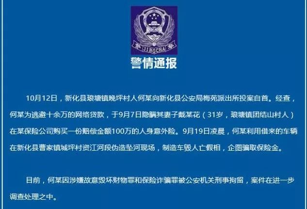 10月12日晚,@新化公安 发布通报称,12日,何某向新化县公安局梅苑派出所投案自首。经查,何某为逃避十余万的网络贷款,于9月7日瞒着其妻子戴某花在某保险公司购买一份赔偿金额100万的人身意外险。9月19日凌晨,何某利用借来的车辆在新化县曹家镇城坪村资江河段伪造坠河现场,制造车毀人亡假相,企图骗取保险金。