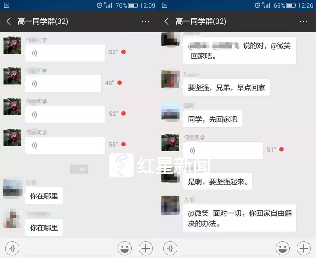 而就在11日晚,戴新艳及其家人在当地微信群里看到了何某在其“高中同学群”里发了数段语音。截图显示,微信备注名为“何某同学”在群里发了5段语音,其他人则回复“你在哪里”、“同学,先回家吧”……