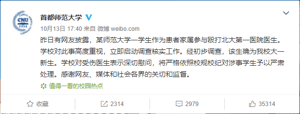 10月13日,郑某蕊就读大学首都师范大学官微发布声明,证实郑某蕊确为本校大一新生。并表示学校对受伤医生表示深切慰问,将严格依照校规校纪对涉事学生予以严肃处理。
