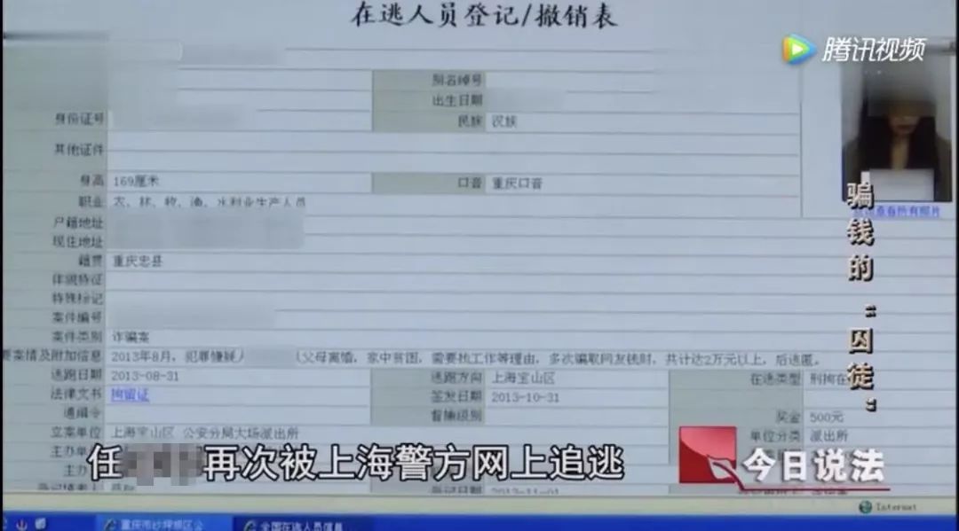 据央视报道,2013年8月,任欣被上海警方网上追逃,案由是多次骗取网友钱财,共计达两万元以上,后逃匿。很快,任欣被抓回。