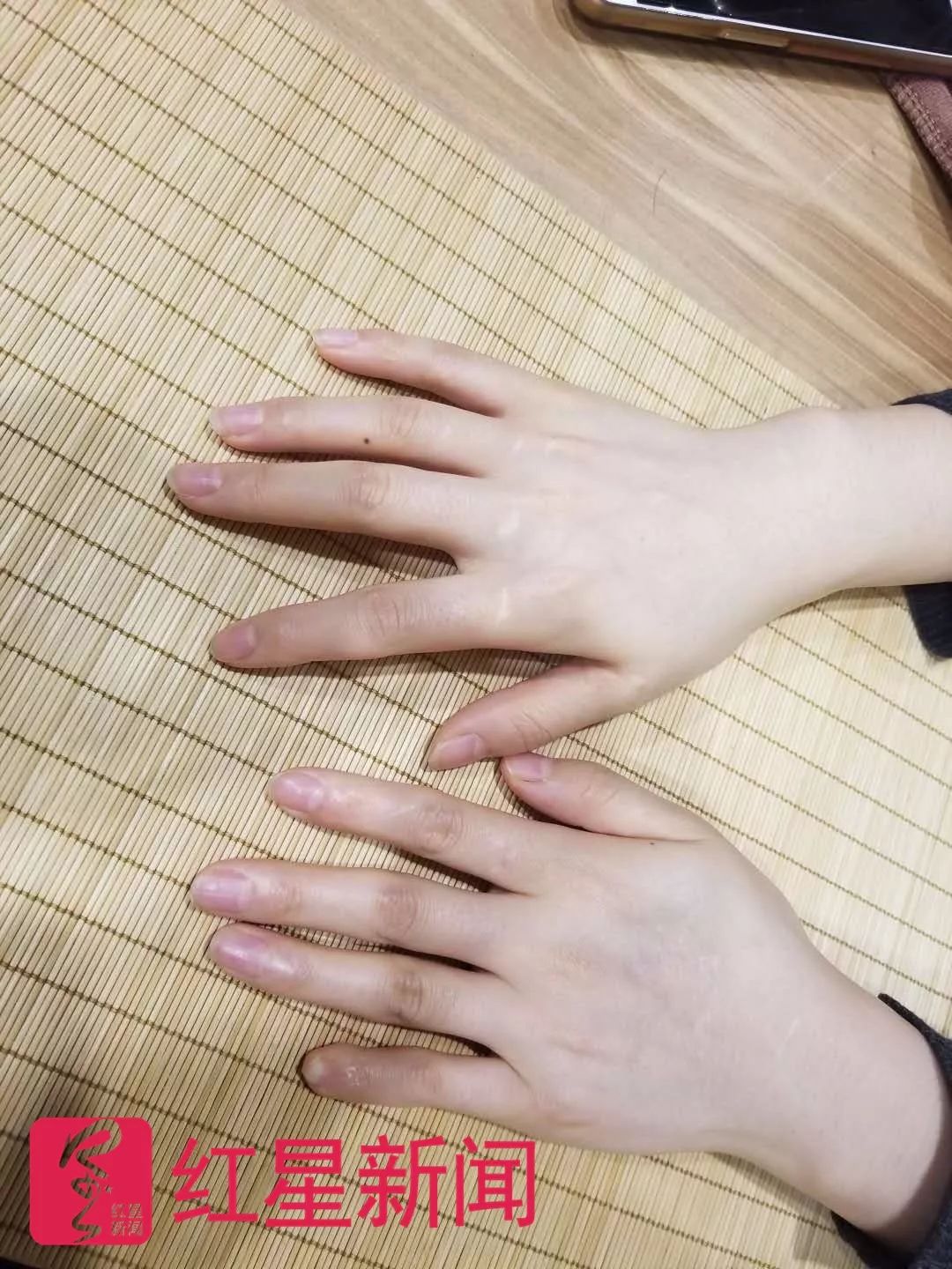▲任欣(化名)变形的左手小指 图片来源:红星新闻