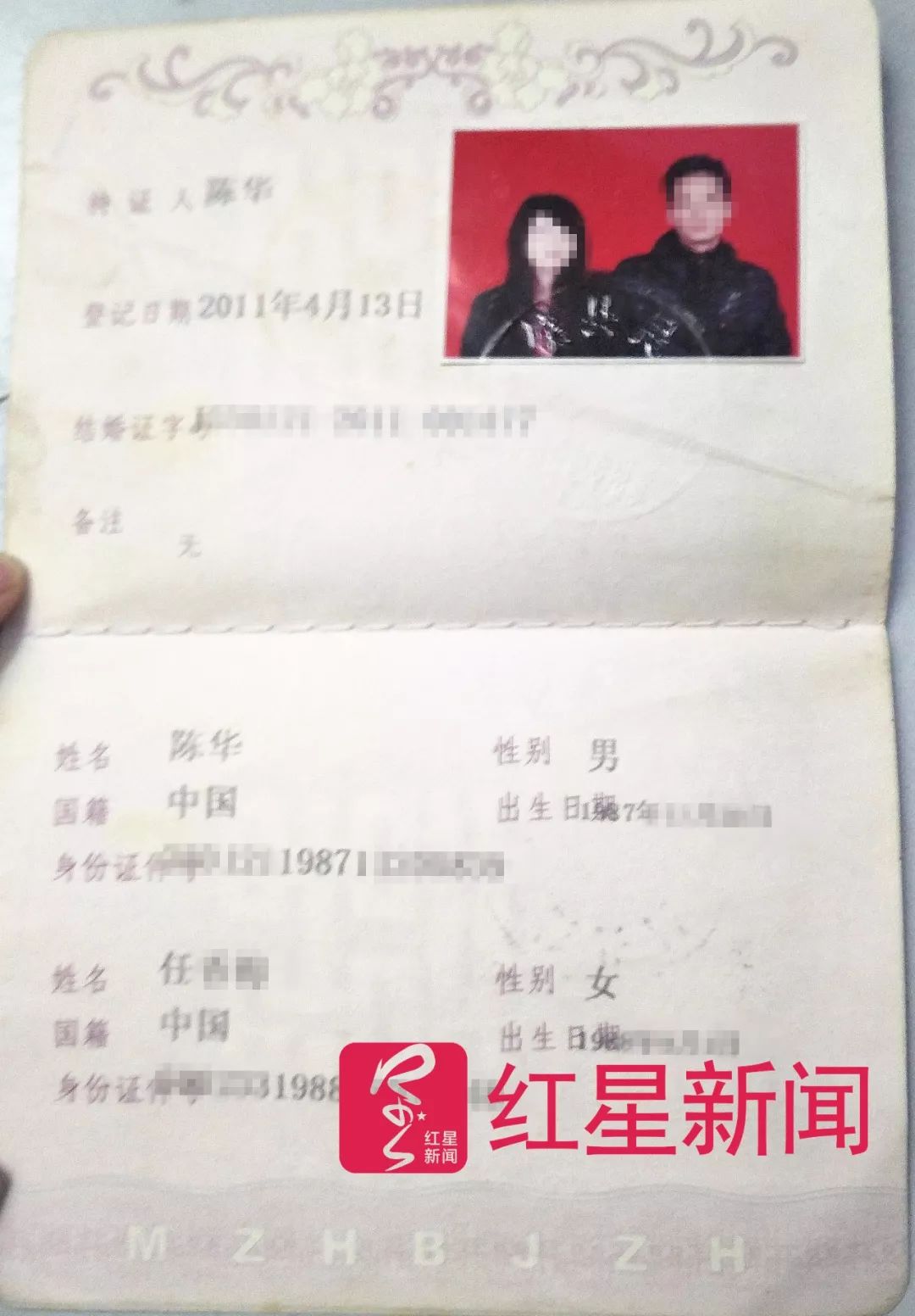▲任欣(化名)和陈华的结婚证 受访者供图