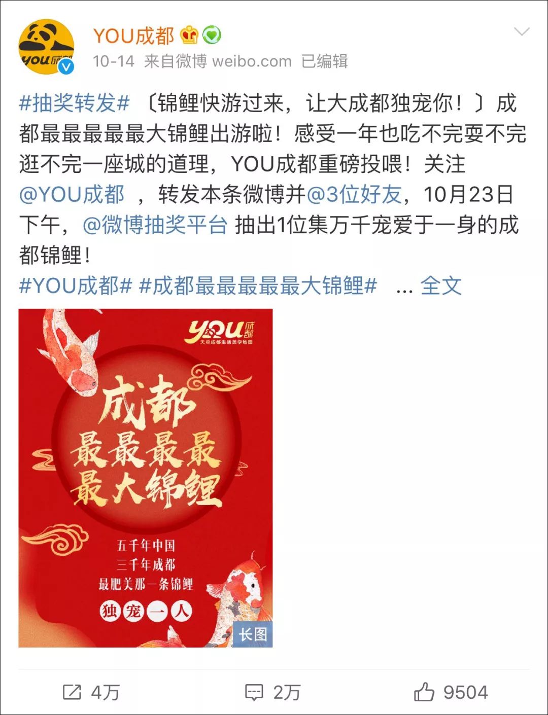 “寻找成都巨型锦鲤”活动期间,全国各地网友积极参与互动,短短9天,YOU成都抽奖微博便获得了750余万的阅读量,6万余次转发,2万余条留言,截止活动结束之前,依然热度不减。