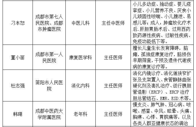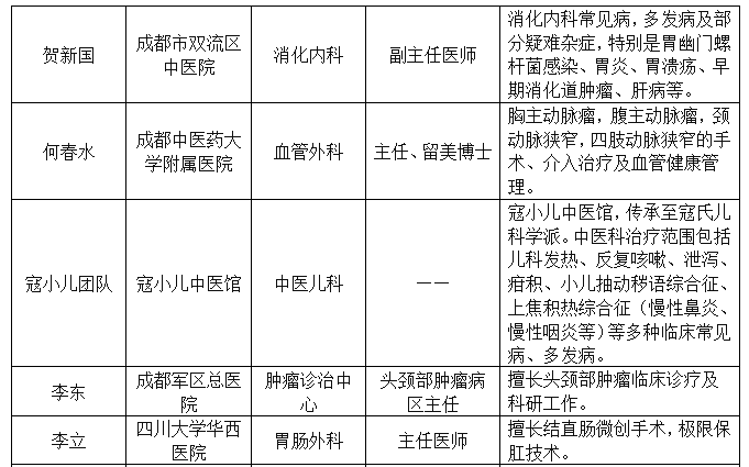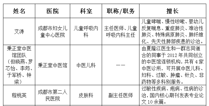 比如,在成都广受赞誉的“四大儿科天团”刁本恕、肖小儿国医馆团队、寇小儿团队、秉正堂中医馆团队,深受病友爱戴的大牛医生四川大学华西医院血液内科的刘霆教授、四川大学华西医院胃肠外科主任医师李立等,他们都要来!