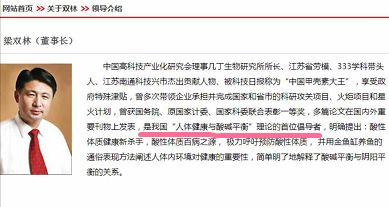 ▲梁双林公司官网对梁双林的简介中提及,他是我国“人体健康与酸碱平衡”理论的首位倡导者