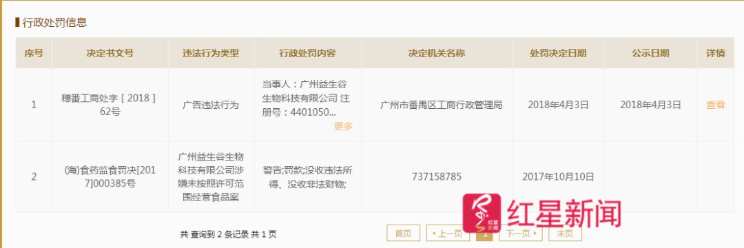 红星新闻记者在国家企业信用信息公示系统查到,广州益生谷生物科技有限公司分别于2017年10月、2018年4月受到两次行政处罚。其中,2017年10月,该公司涉嫌未按照许可范围经营食品被处罚。2018年4月,公司因广告违法被广州市番禺区工商行政管理局责令停止违法行为,罚款4.5万元。
