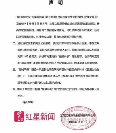 11月15日,红星新闻记者再次查看其官网时,这封道歉信和原本挂在网页右侧的媒体正面报道一同消失,一份新的声明,言辞相对柔和,在正文中提到“理论对与错可供大家讨论与商榷……”、“市面上某些企业利用‘酸碱平衡’理论宣传自己产品的一切行为与我公司无关”……