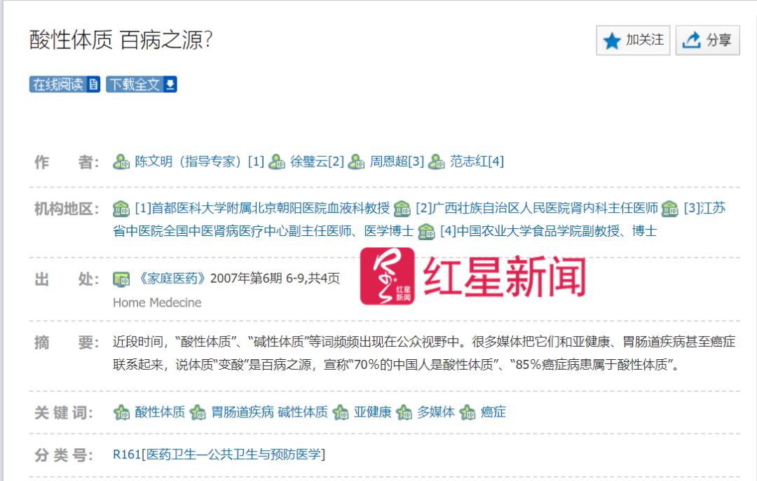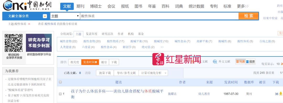 ▲记者在中国知网上查到,最早一篇关于酸碱体质的文章是在1987年