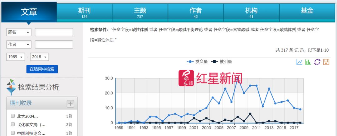 在维普资讯中文期刊服务平台上,以“酸性体质”作为检索词,可查找到241条记录。如果增加相关检索词,扩展至最贴近该理论的“碱性体质”、“酸碱平衡理论 ”、“酸碱体质 ”和“食物酸碱 ”,则共检索到317条结果。