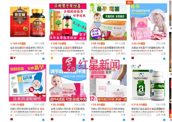 其中最受欢迎的当属备孕,绝大部分碱性保健品、食品的介绍都与“备孕”相关,此外还有“碱胶调理液”“妇用小苏打”“女性私处洗液”等。这当中,销售商家较多的为一款名为“ESG益生碱”的产品,其定位为“备孕高碱性食品”。