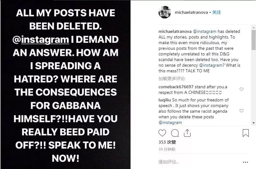 然而,曝光Stefano Gabbana辱华言论后,Michaela账号上的内容却因为“散布仇恨言论”而被平台删除。就连自己以前发的那些跟该事件无关的内容也被删除。Michaela质疑道,Gabbana自己的言论后果还没看到,自己账号倒被限制,平台是否被买通,要求给出说法。据内幕网(insider)报道,对此,Instagram拒绝评论。
