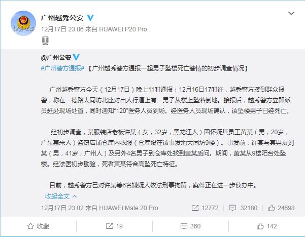 12月17日,广州越秀公安通报了一起引人关注的坠楼事件。