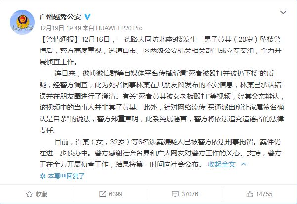 12月19日,广州越秀公安再发布通报,回应“死者被殴打并被扔下楼”等质疑: