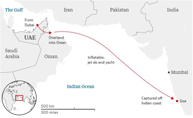 拉莉法的逃跑路线图:经陆路越境进入阿曼,随后乘坐充气艇和水上摩托车出海,在与若贝尔汇合后乘游艇驶向印度果阿,距海岸30英里处遭到拦截。图据《卫报》