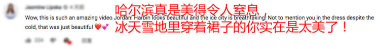这段视频也美哭了一众外国网友:“哈尔滨真是美得令人窒息,冰天雪地里穿着裙子的你实在是太美了!”