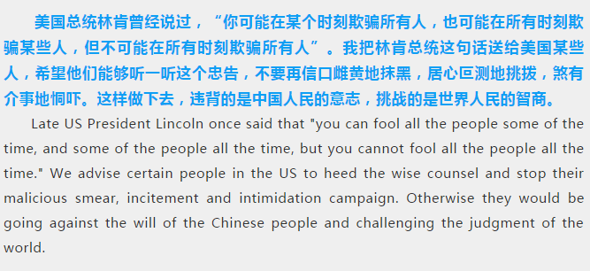美国总统林肯曾经说过,“你可能在某个时刻欺骗所有人,也可能在所有时刻欺骗某些人,但不可能在所有时刻欺骗所有人”。我把林肯总统这句话送给美国某些人,希望他们能够听一听这个忠告,不要再信口雌黄地抹黑,居心叵测地挑拨,煞有介事地恫吓。这样做下去,违背的是中国人民的意志,挑战的是世界人民的智商。
