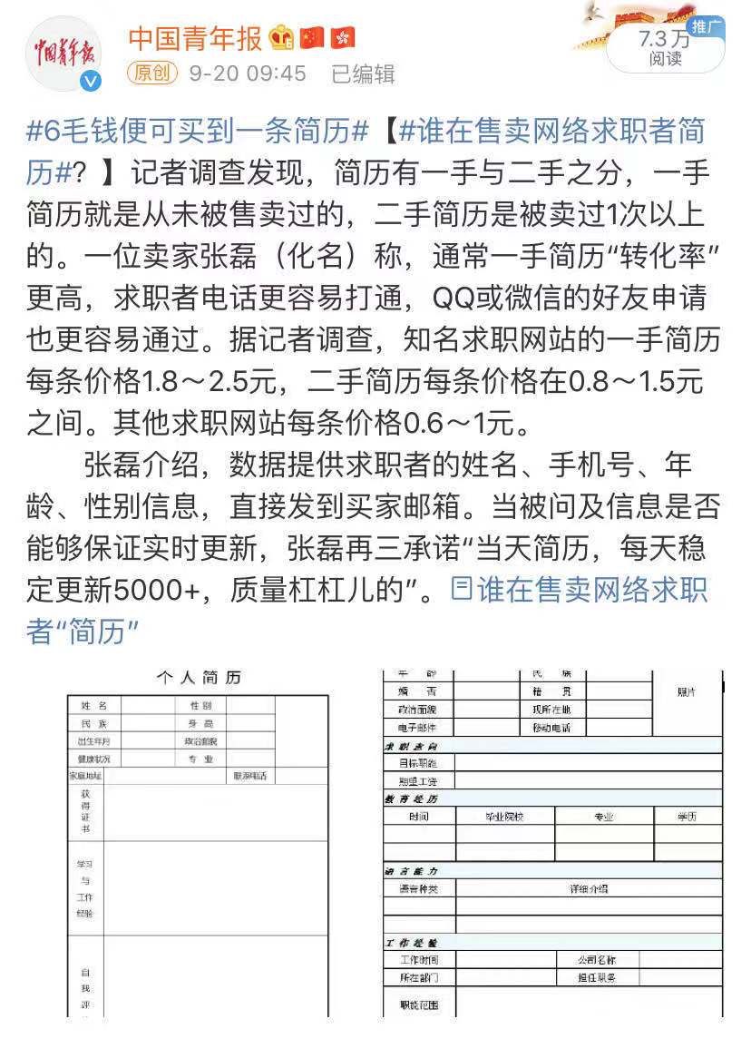 “简历收集”产业链一经曝光,话题#1元即可购买一条简历#迅速冲上微博热搜: