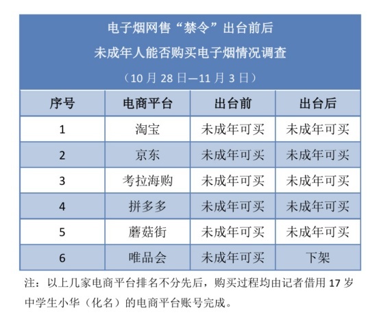 此前,国家烟草专卖局和国家市场监督管理总局于11月1日联合发布《关于进一步保护未成年人免受电子烟侵害的通告》(简称《通告》)。记者调查发现,无论在线下还是线上,未成年人目前还可以轻易购买到电子烟。