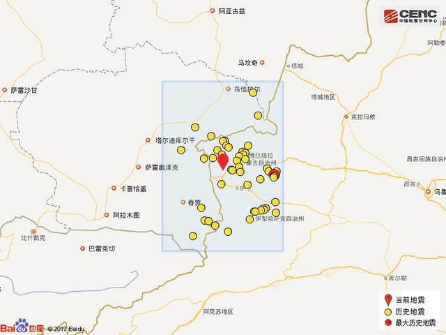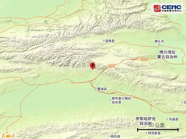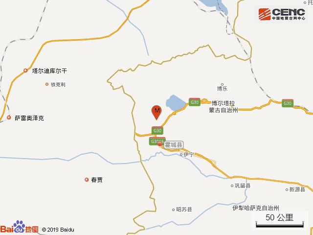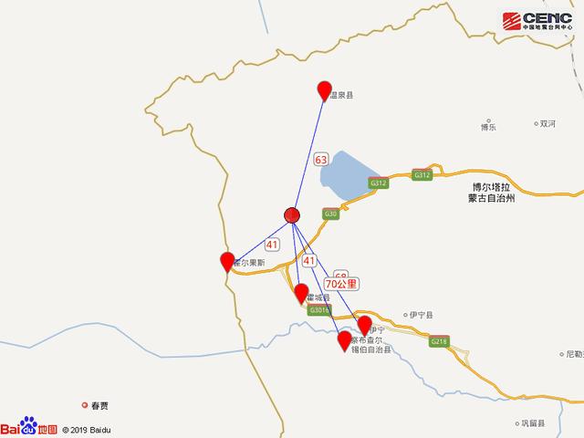 周边县城:震中距霍城县41公里、距霍尔果斯市41公里、距温泉县63公里、距伊宁市68公里、距察布查尔锡伯自治县70公里,距可克达拉市56公里,距乌鲁木齐市549公里。