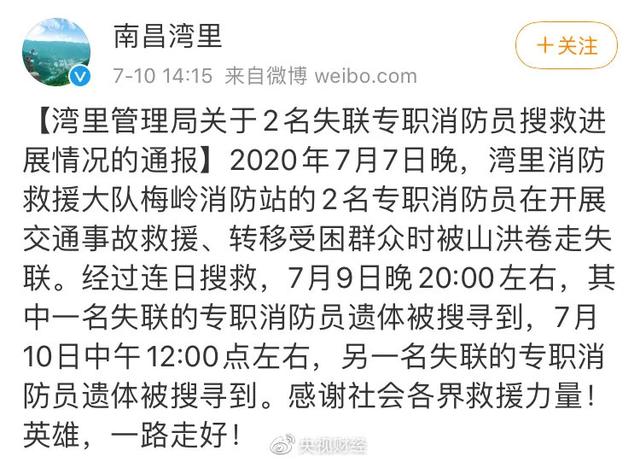 据江西省南昌市湾里区消息,7月7日晚,湾里消防救援大队梅岭消防站的2名专职消防员在开展交通事故救援、转移受困群众时被山洪卷走失联。经过连日搜救,7月9日20时左右,其中一名失联的专职消防员遗体被搜寻到,7月10日中午12时左右,另一名失联的专职消防员遗体被搜寻到。