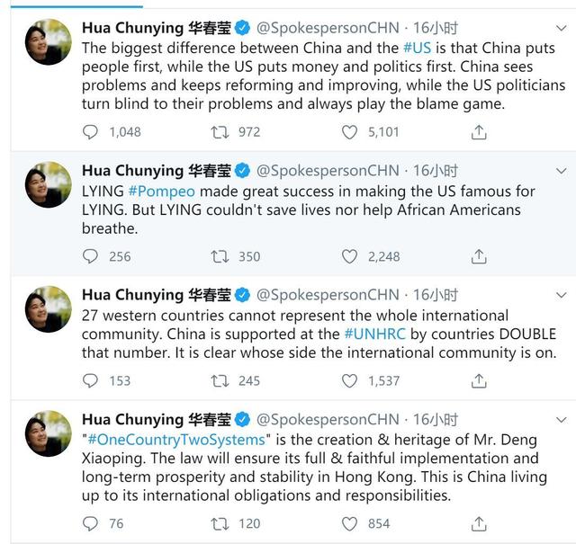 华春莹还点名美国国务卿蓬佩奥,称说谎的蓬佩奥成功让美国以谎言闻名。但说谎并不能拯救生命,或帮助非裔美国人呼吸。