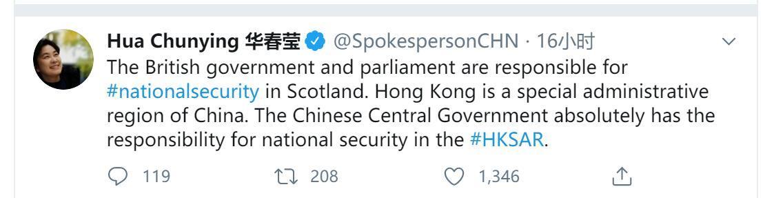 华春莹首先提到,苏格兰地区的国家安全责任由英国政府及议会承担,香港作为中国的特别行政区,中国中央政府绝对应该为此地的国家安全负责。
