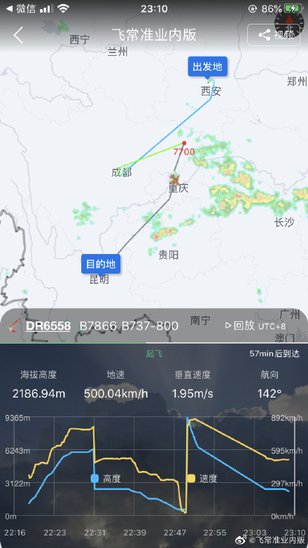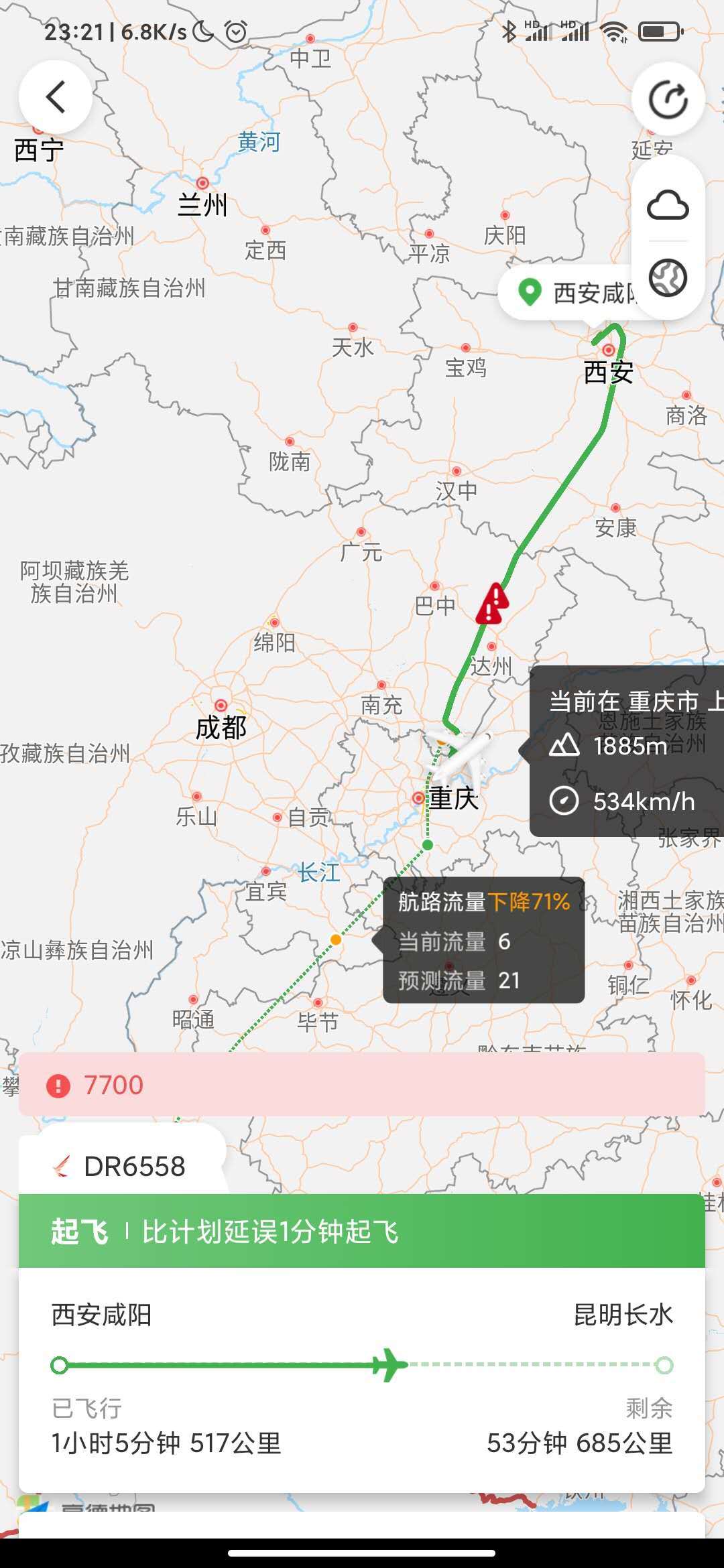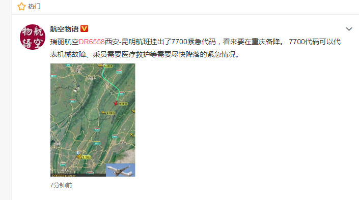 7月6日晚11点10分左右,@航空物语发布消息称,瑞丽航空DR6558西安-昆明航班,稍早前挂出7700紧急情况代码,前往重庆备降。