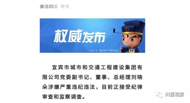 “宜宾市城市和交通工程建设集团有限公司党委副书记、董事、总经理刘晓朵涉嫌严重违纪违法,目前正接受纪律审查和监察调查。”