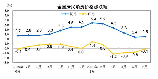 7月9日,国家统计局网站发布消息,2020年6月份,全国居民消费价格同比上涨2.5%。其中,城市上涨2.2%,农村上涨3.2%;食品价格上涨11.1%,非食品价格上涨0.3%;消费品价格上涨3.5%,服务价格上涨0.7%。上半年,全国居民消费价格比去年同期上涨3.8%。